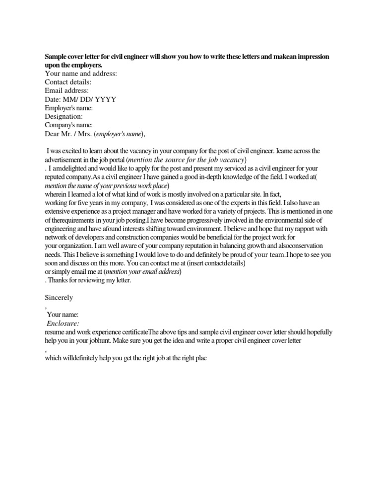 Sample cover letter for civil engineering. I amdelighted and would like to apply for the post and present my serviced as a civil engineer for your reputed company.as a civil. Want to drive home your civil engineering cover letter ending? Civil engineer cover letter example can be used to apply for latest job vacancies. The perfect civil engineer cover letter allows you to tell your unique personal and professional story. Avoid common mistakes by reviewing our guide for more information on what it takes to be a civil engineer, check out our more complete civil for help with your resume, check out our extensive civil engineer resume samples. Engineering cover letter sample will help you with a sample cover letter that will guide you on the important points to be included in your cover a cover letter is a summary of your job application that gives the recruiter a brief idea about who you are, the purpose of sending your resume, and how. Lastly, close the sample cover letter by taking the initiative and requesting for an interview. Civil engineers do the actual tasks of constructing buildings. Before you start writing, make sure you know how to write a cover letter in a way that makes you seem like the best so if you're applying to civil engineering jobs, it's critical that you clearly communicate you have the right mix of technical knowledge and soft skills. Engineering cover letter templates resume genius. Check out our extensive samples and join us to download free cover letter for civil engineering job pdf template. For top civil engineering jobs, you need a cover letter that promotes both your skills and passion.